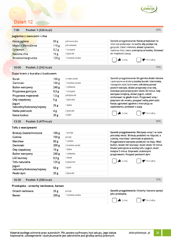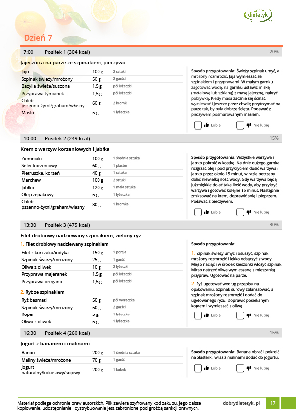 • w formie precyzyjnych jadłospisów wielodniowych (na każdy dzień miesiąca jest opracowany osobny jadłospis). Tutaj nie musisz zastanawiać się co zjeść każdego dnia, gdyż będziesz mieć dokładnie wszystko rozplanowane.