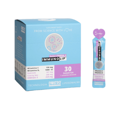 Wysoko przyswajalny unikalny kompleks witamin C, D i w połączeniu z ekstraktem z bzu czarnego oraz wegańskimi kwasami omega-3 z oleju z mikrolag i rokitnika w technologii liposomalnej.